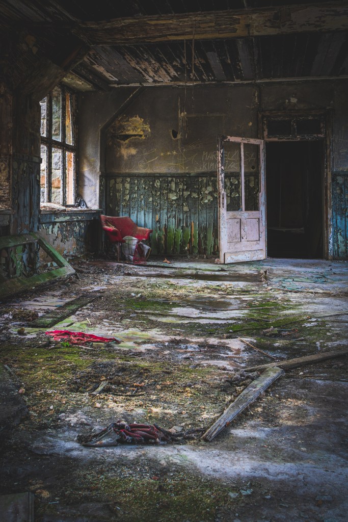 So stand ich in der Eingangshalle, welche früher bestimmt recht eindrucksvoll seine Gäste empfang. Ich erkundete zuerst das Erdgeschoss. Hier war früher der Speisesaal, welcher heute komplett eingefallen ist. Ich machte mehrere Fotos, wegen den schwierigen Lichtverhältnissen, immer mit Stativ. Im Obergeschoss angekommen fand ich die Besucherzimmer. Der Putz war hier schon vor langer Zeit von den Wänden gefallen, aber Lampen und Gardinen hielten sich immer noch an den für sie vorgesehenen Plätzen. Sehr morbide anzusehen. Gefällt mir sehr!