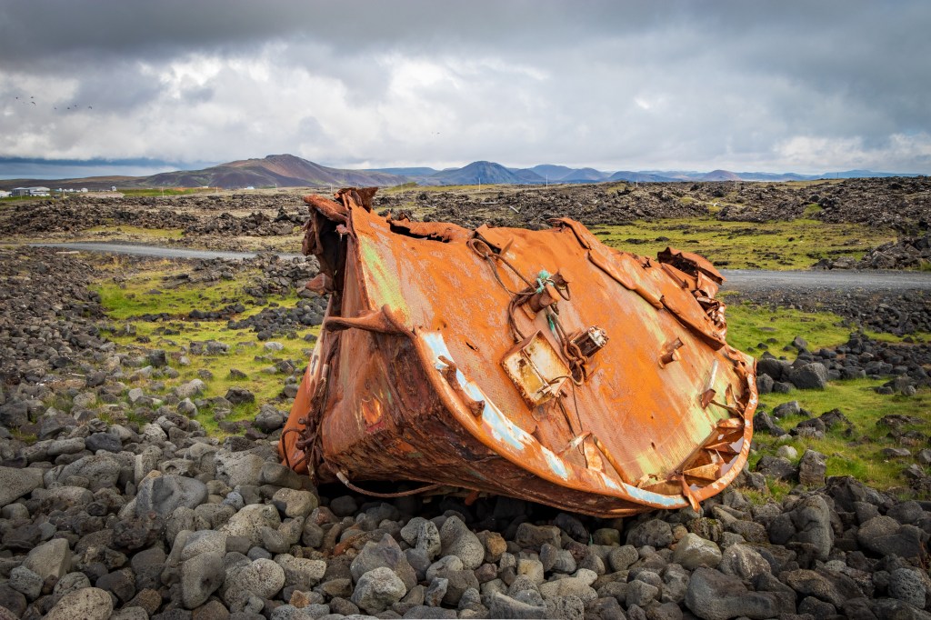 Erkunden Sie das verlassene Hrafn Sveinbjarnarson III Schiffswrack an Islands Küste. Die rostigen Überreste des Schiffs bilden eine surreale Kulisse und erzählen eine Geschichte von Vergangenheit und Verfall. Fotografieren Sie die melancholische Schönheit dieses beeindruckenden Wracks.