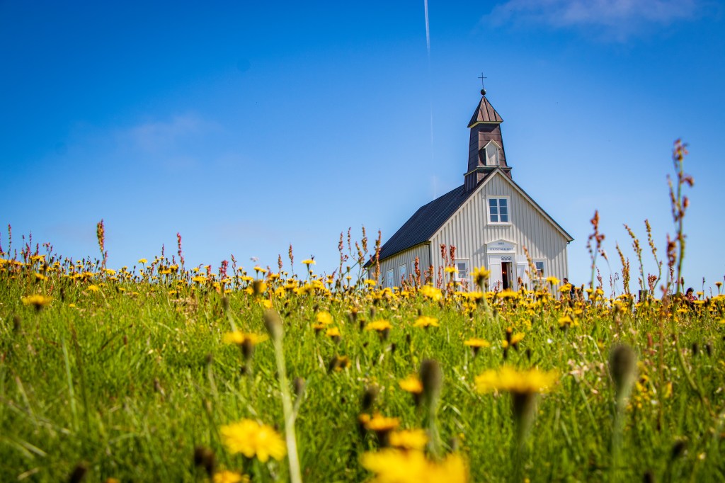 Strandarkirkja, die Kirche am Strand, ist ein malerisches kleines Gotteshaus inmitten der Natur. Der Kontrast zwischen dem weißen Kirchengebäude und der umgebenden schwarzen Sandlandschaft macht diesen Ort zu einem perfekten Fotomotiv.
