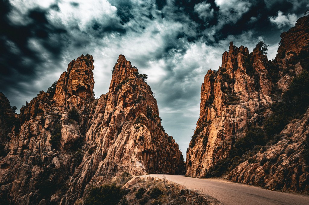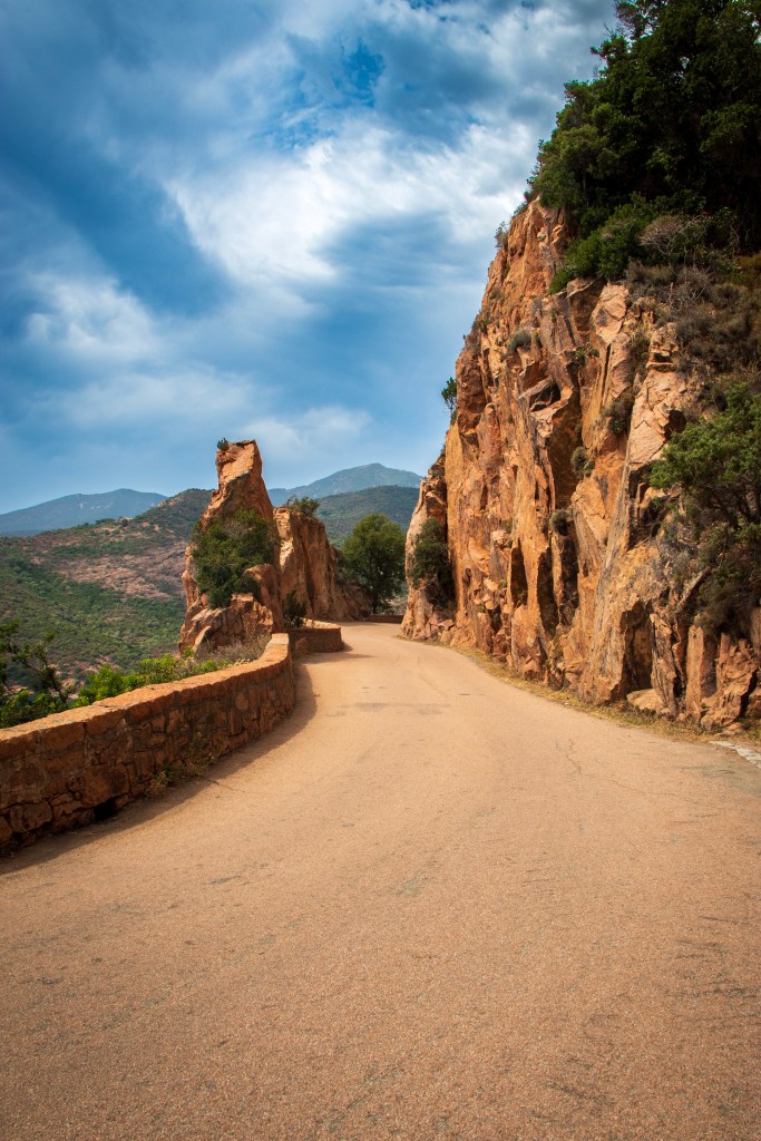 Weiter ging es Richtung Westen, wo wir auf dem Camping Corsica Gradelle übernachteten wollten. Auf den Weg dorthin, kamen wir rein zufällig an der bizarre Felsenlandschaft Calanche vorbei. Die Felsen aus rötlichem Granit liegen in etwa 400 m Höhe über dem Meeresspiegel direkt an der Küste und sind ein tolles Fotomotiv. Unser angesteuerter Platz liegt inmitten wilder Natur, und wir verbrachten den Tag damit, die umliegenden Berge und den Strand. Der Campingplatz selbst ist einfach, aber sauber und sehr charmant. Abends saßen gingen wir in die dem Platz angeschlossene Pizzeria, welche sehr zu empfehlen ist. Abends hatten wir einen exklusiven Blick aus unserem Dachzelt auf ein Gewitter welches in der Bucht festhing.