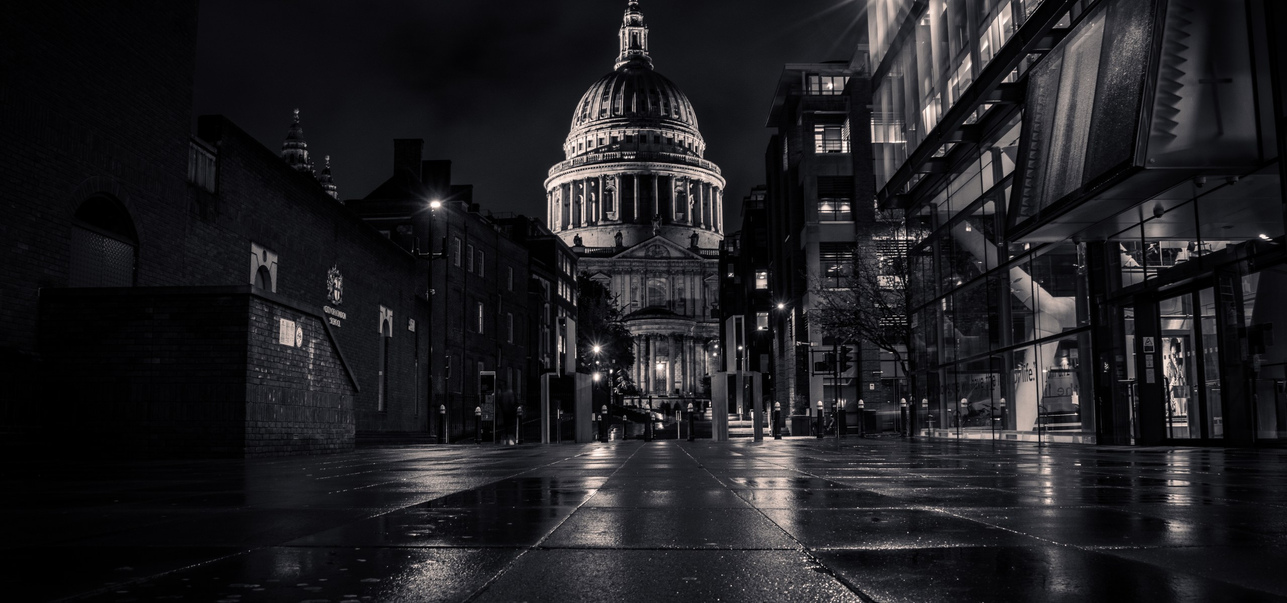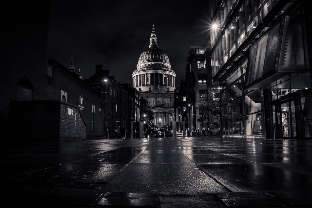 Schwarz und weiß reduziert auf das Wesentliche: Licht, Schatten und Geschichte.St. Paul’s steht ruhig und monumental da, als würde die Zeit für einen Moment anhalten.