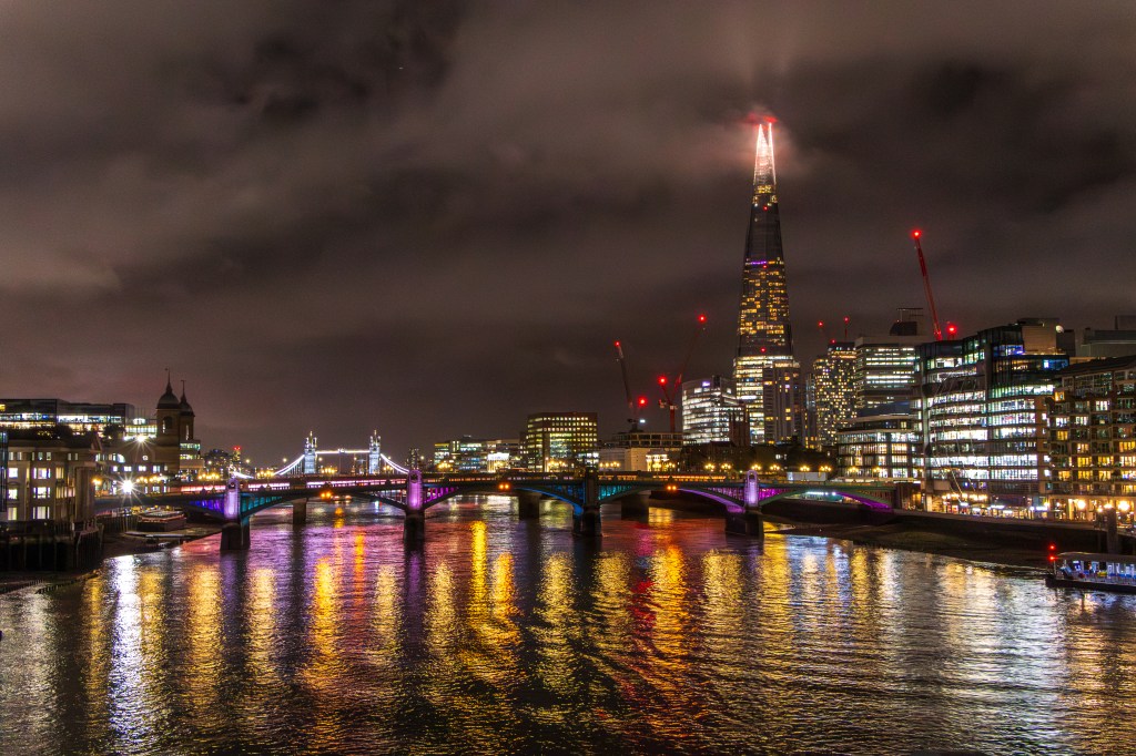 Wenn die Nacht London umarmt, beginnt die Skyline zu leuchten.The Shard ragt wie ein Leuchtfeuer in den Himmel.Ein Blick von der Millennium Bridge, der bleibt.