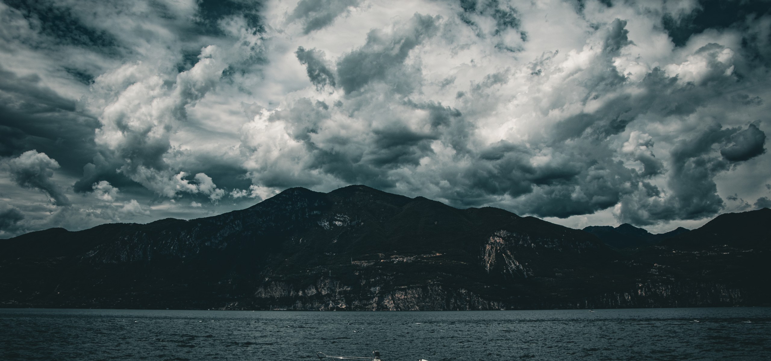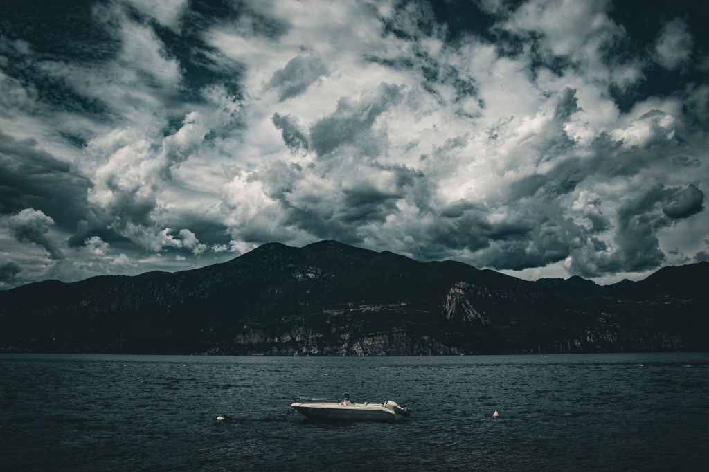 Ein Boot liegt reglos vor Anker, klein vor der gewaltigen Kulisse der Berge, die sich düster gegen den Himmel zeichnen. Das Wasser scheint den Atem anzuhalten, als würde es die Kraft des nächsten Augenblicks sammeln. In dieser dramatischen Stille spürt man: Manchmal liegt die größte Stärke nicht im Aufbruch, sondern im standhaften Verweilen.