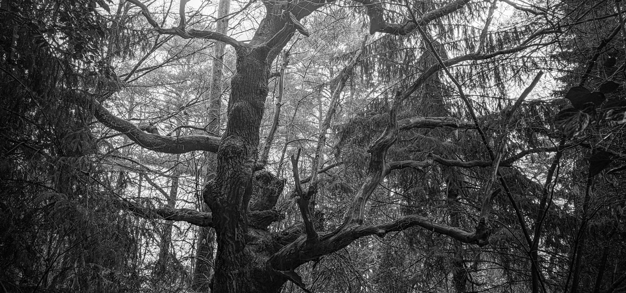 Die alte Eiche steht wie ein Wächter vergangener Zeiten im stillen, nebelverhangenen Wald. Ihre knöchernen Äste zeichnen sich scharf gegen das fahle Grau des Himmels, als würden sie Geschichten aus Jahrhunderten erzählen. Im Schwarz-Weiß wirkt jeder Schatten wie eine Erinnerung, die nie vergeht.