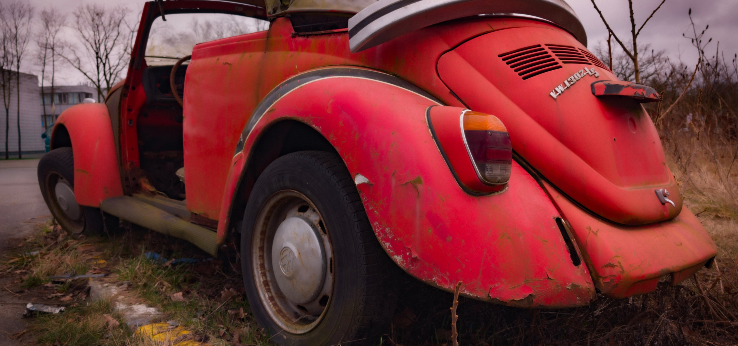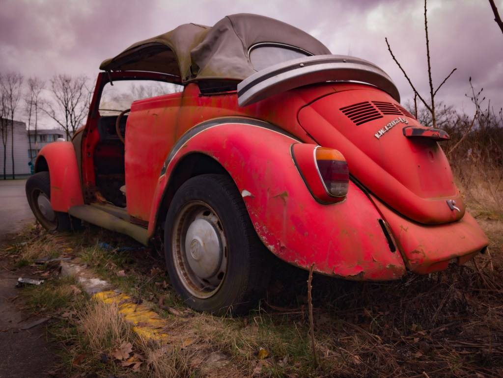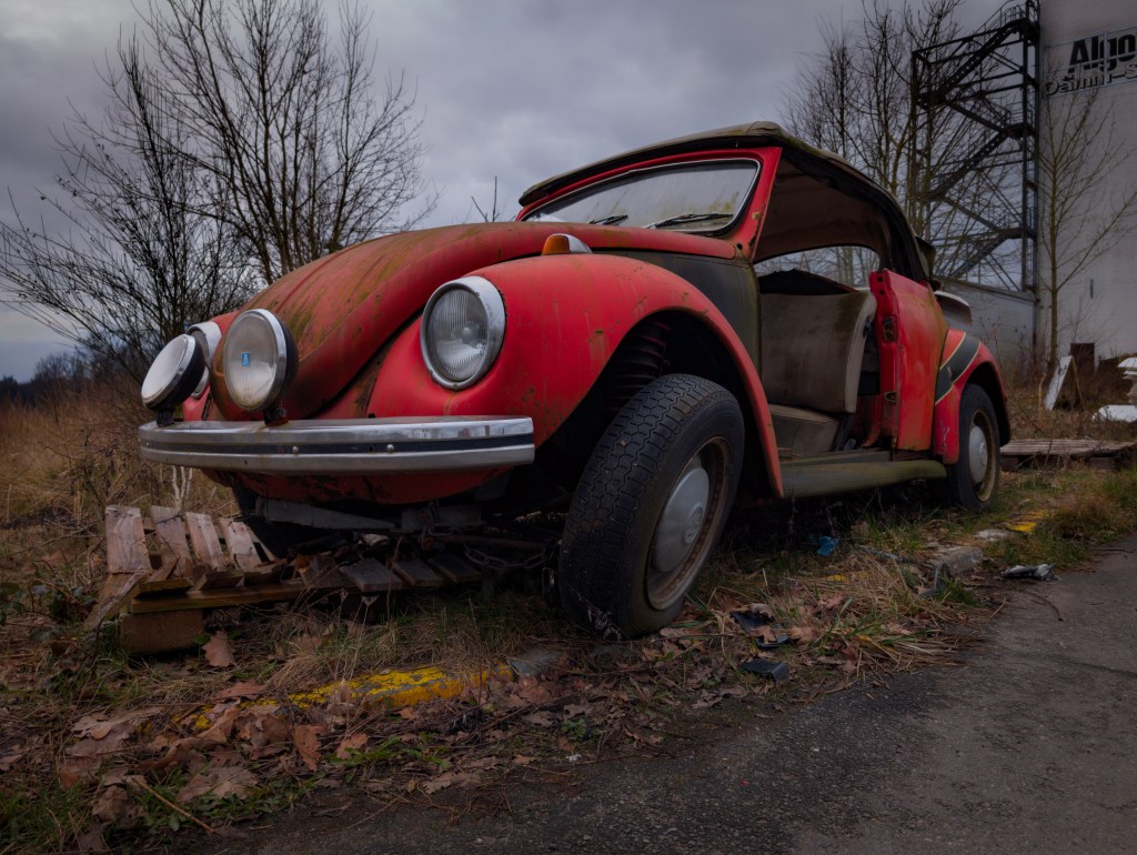 Dieser alte VW Käfer steht heute in einem desolaten Zustand, doch jede Beule und jede Roststelle erzählt von Jahrzehnten auf der Straße.